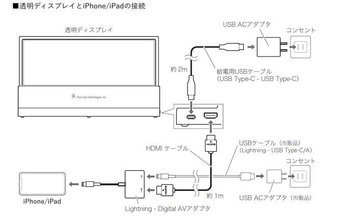 ケーブルで接続すると、iPhone / iPad の画面がそのまま透明ディスプレイにミラーリング表示されます。