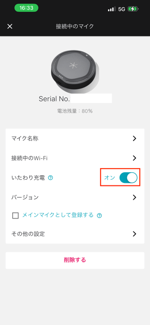 マイクのバッテリー寿命をより長く保つための「いたわり充電」を設定できます。
