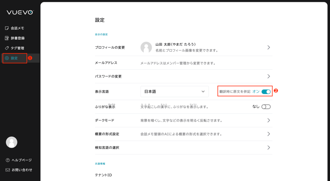 原文併記モードをオンにすると、相手の発言を翻訳結果とあわせて元の言語(原文)も表示できます。